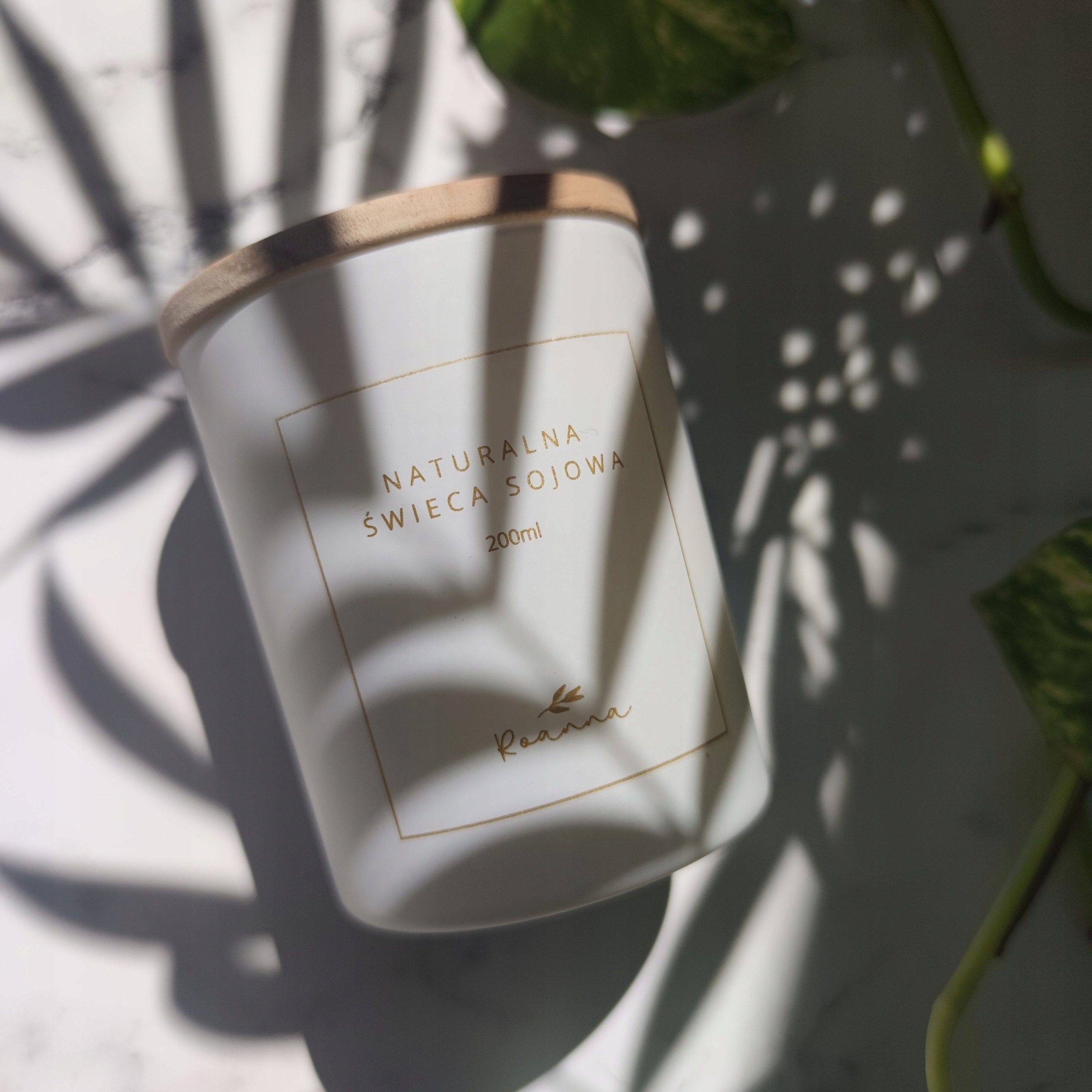 - Ręcznie robionej świecy sojowej z bawełnianym knotem: 100% wosk sojowy, zapach Bursztyn (nuty zapachowe: kadzidło, bursztyn, skóra),