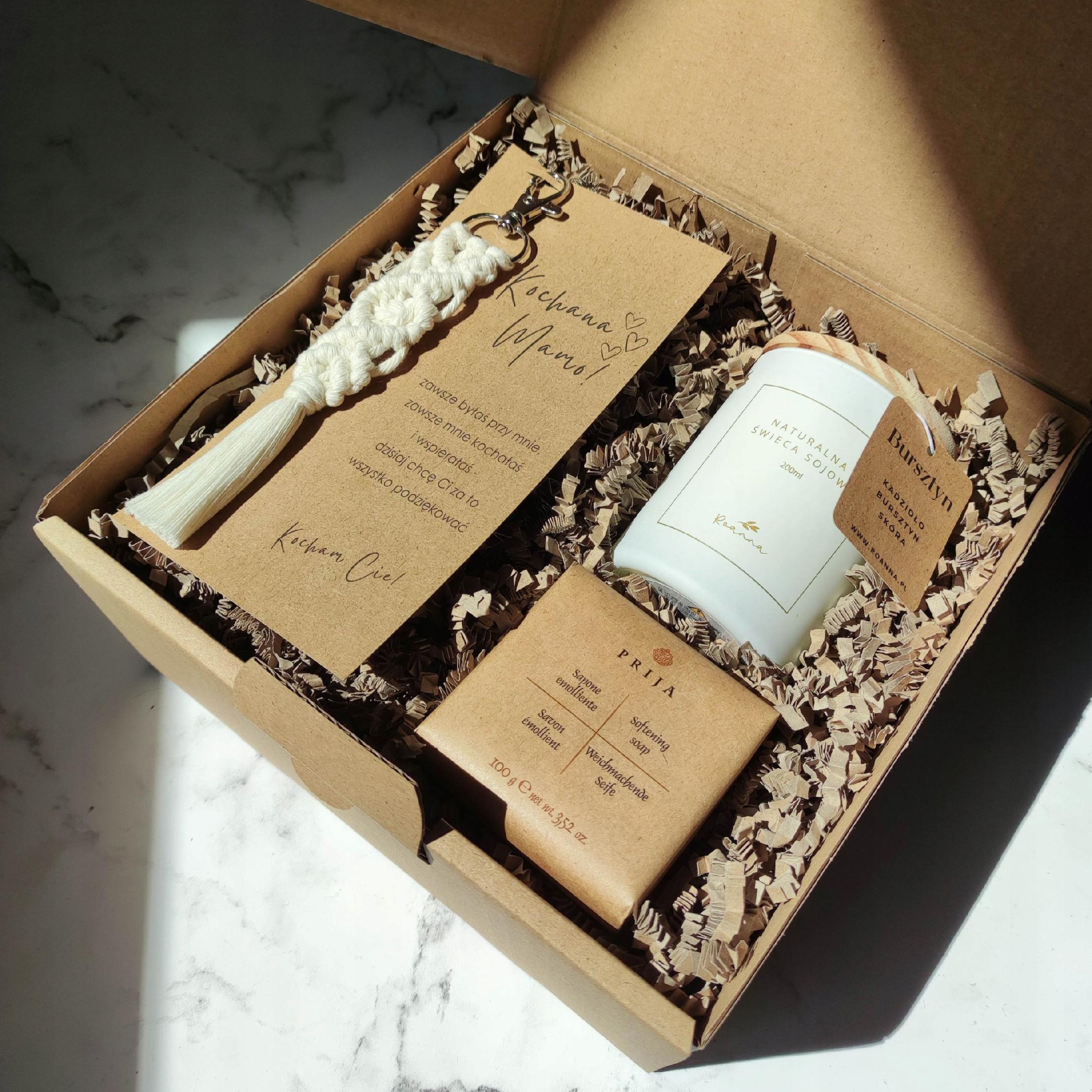 Zapakowane w estetyczne pudełko z ekologicznym wypełniaczem.